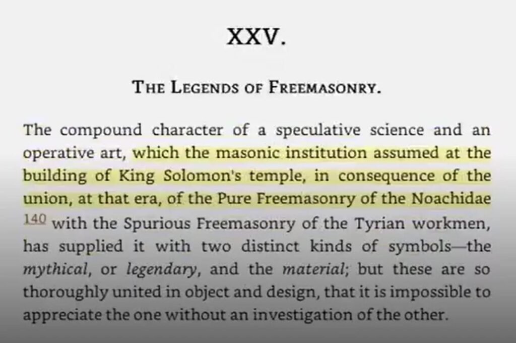 जिसे मेसोनिक संस्था ने राजा सोलोमन के मंदिर के निर्माण के समय ग्रहण किया था, जो उस युग में नोआकिडे परिवार के शुद्ध फ्रीमेसनरी के विलय के परिणामस्वरूप हुआ था। “हम देखते हैं कि यह सब किस प्रकार पुरुष और स्त्री के संयुक्त रूप को उभयलिंगी देवता और उभयलिंगी मनुष्य के रूप में दर्शाता है।