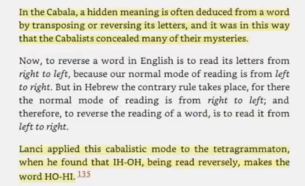 कबाला में, किसी शब्द के अक्षरों को उलट-पलट कर या उलटकर अक्सर उसका छिपा हुआ अर्थ निकाला जाता है, और इसी तरह कबालिस्टों ने अपने कई रहस्यों को छुपाया था।” “लैंसी ने इस कबालिस्टिक पद्धति को टेट्राग्रामेटन पर लागू किया, जब उन्होंने पाया कि IH-OH को उल्टा पढ़ने पर HO-HI शब्द बनता है।”