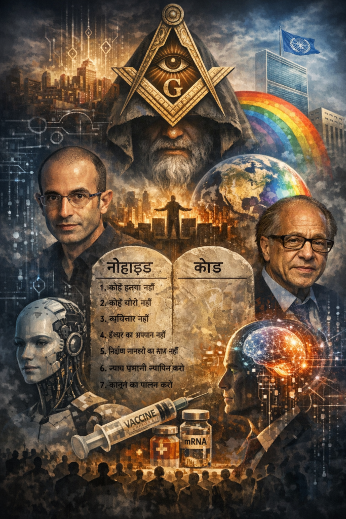मैं आपको विश्वास दिलाता हूँ कि यदि आप इस लेख को ध्यानपूर्वक पढ़ेंगे और नीचे दिए पूरक लेखों के साथ इसका अध्ययन करेंगे, तो आपको हमारी दुनिया की असलियत और उसमें घट रहे घटनाक्रम की काफी हद तक पूरी समझ हो जाएगी। इसे स्वीकार करना पूरी तरह से आप पर निर्भर करेगा।फ्रीमेसन और नूहाइड कानून, Yuval Noah Harari, Ray Kurzweil और वैक्सीन — पहली नज़र में ये सब अलग-अलग विषय लगते हैं। लेकिन वास्तविकता में, ये सभी एक ही पोस्ट-ह्यूमन सिस्टम के अलग-अलग चरण हैं।